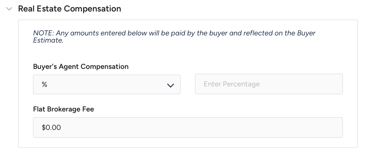 Use the dropdowns to input these amounts as either a percentage of the sales price or a fixed dollar amount. To indicate split compensation, simply enter the respective dollar amount or percentage that the Buyer is responsible for in the appropriate fields. Additionally, you can include compensation as a line item under āFlat Brokerage Feeā.