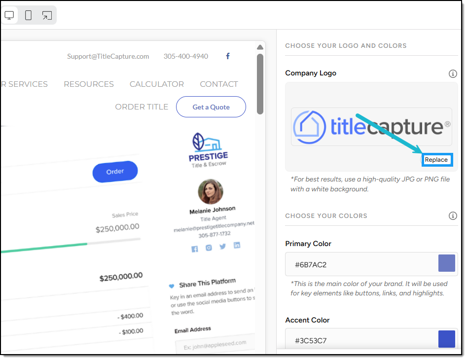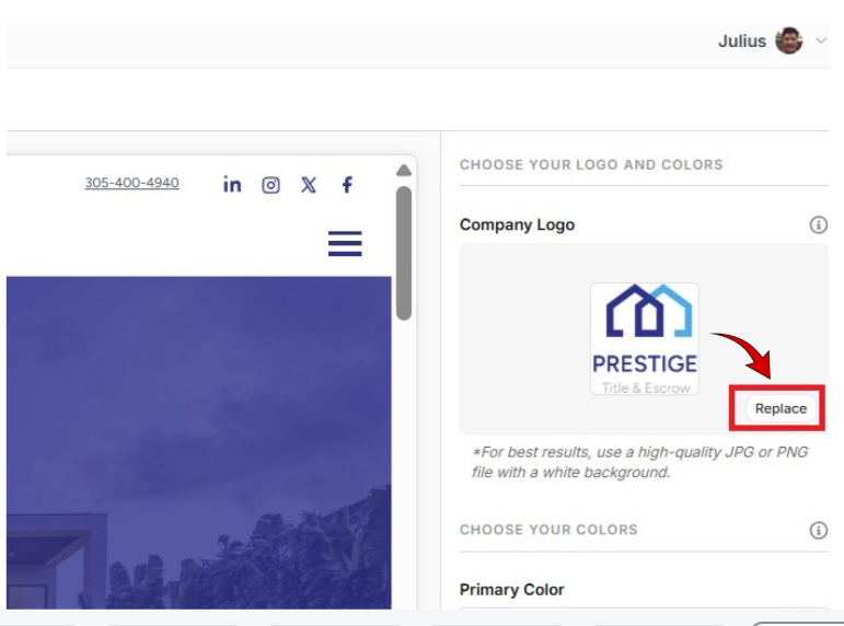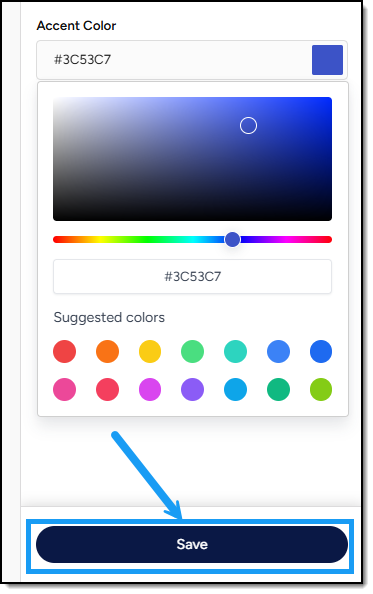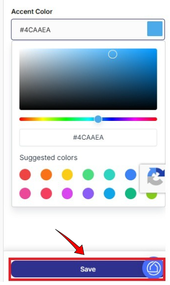 In the Choose Your Colors section on the right, select your Primary Color and Accent Color by entering color codes or using the color picker. *Primary Color is the main color of your brand. It will be used for key elements like buttons, links, and highlights. Accent Color is a secondary color that complements your primary color. It’s used for emphasis, subtle details, and interactive elements.