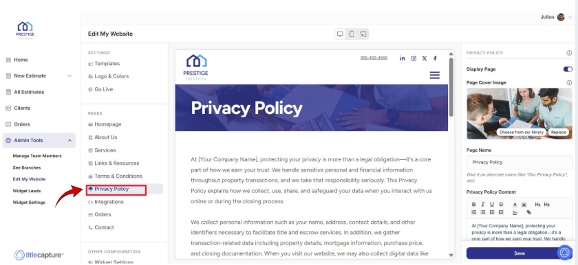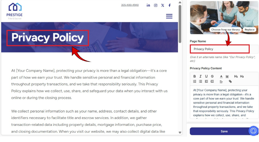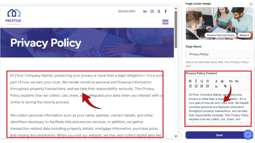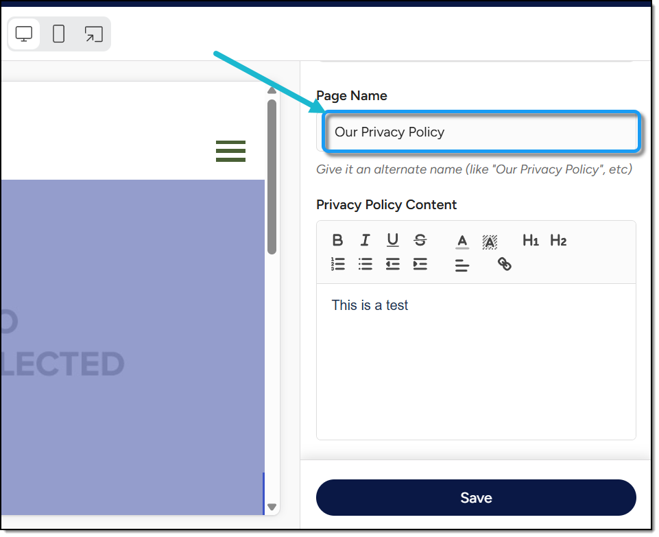 After saving, review the updated Privacy Policy page in the center preview area.