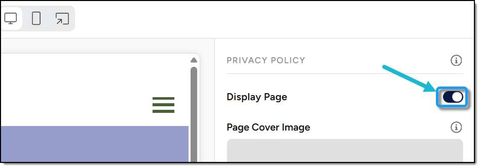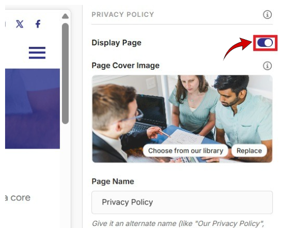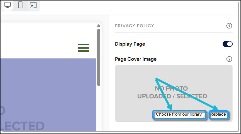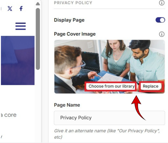 On the right-hand side of the screen, under Privacy Policy, select a Page Cover Image from the image library (which contains images you’ve already uploaded, and any default images provided by the platform), or click Replace to upload a new cover image from your computer.