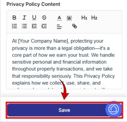 In the Privacy Policy Content section, enter or paste your privacy policy text using the editor. Formatting tools are available to organize content using headings, lists, and text styling.