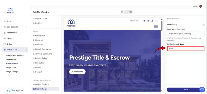 In the Navigation Link Name field, enter the name you want displayed in your website’s navigation menu (for example, “Blog,” “News,” or “Insights”).