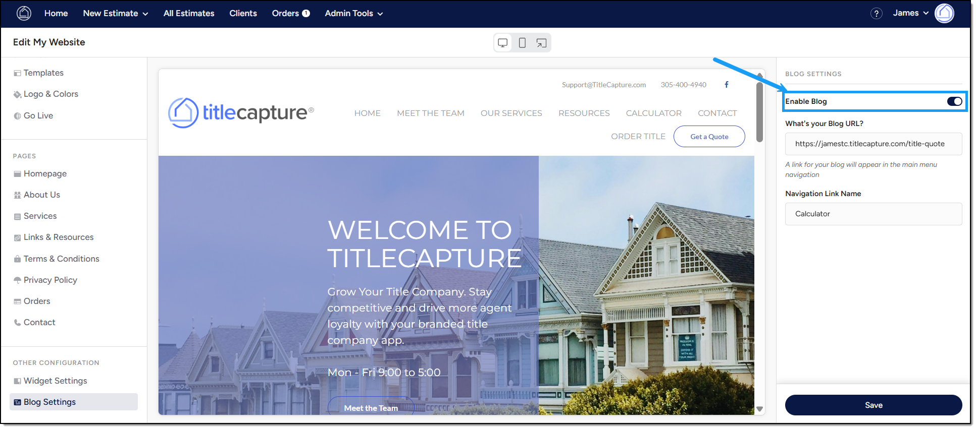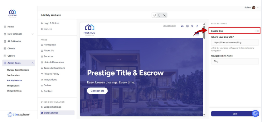On the right-hand side of the screen, locate the Enable Blog toggle.